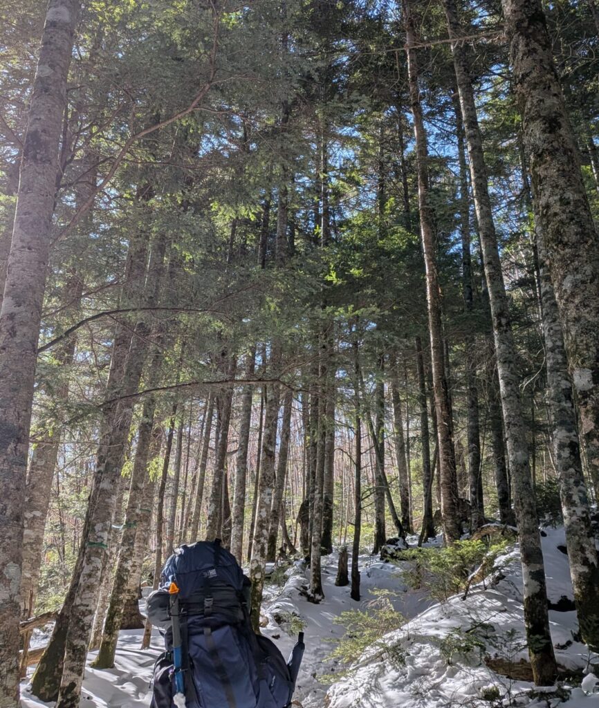 12:40 良く晴れて、木漏れ日の差し込む気持ちのいい雪道歩きを、休憩をはさみつつ3時間ほど続けたところで標高2450Mくらいの幕営適地に到着。一旦荷物を置いて、もっと高い地点の幕営適地を探しつつ展望デッキまで歩きます。重い荷物を置くと、かえって足元ふらふらしちゃう。