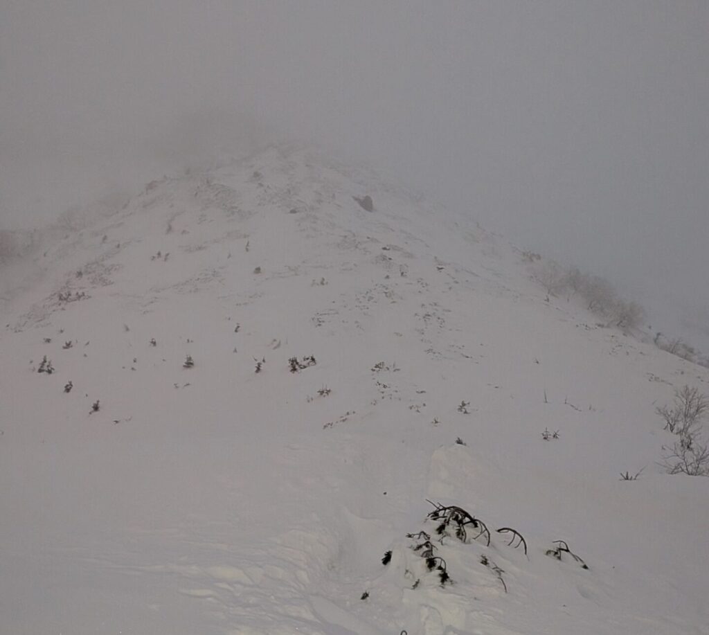 真っ白な山頂を、それでも一応記録として写真に残してから、来た道を下ります。できるならダッシュで下りたいのですが、登りでビビっていた斜面を下りでビビらないわけがなく、先輩方に待ってもらいつつ慎重に下山。ただ、怖いとは言っても頼れる先輩方がいることで安心感も大きく、歩き方も教わりつつ下山出来て、とてもありがたかったと思います。
