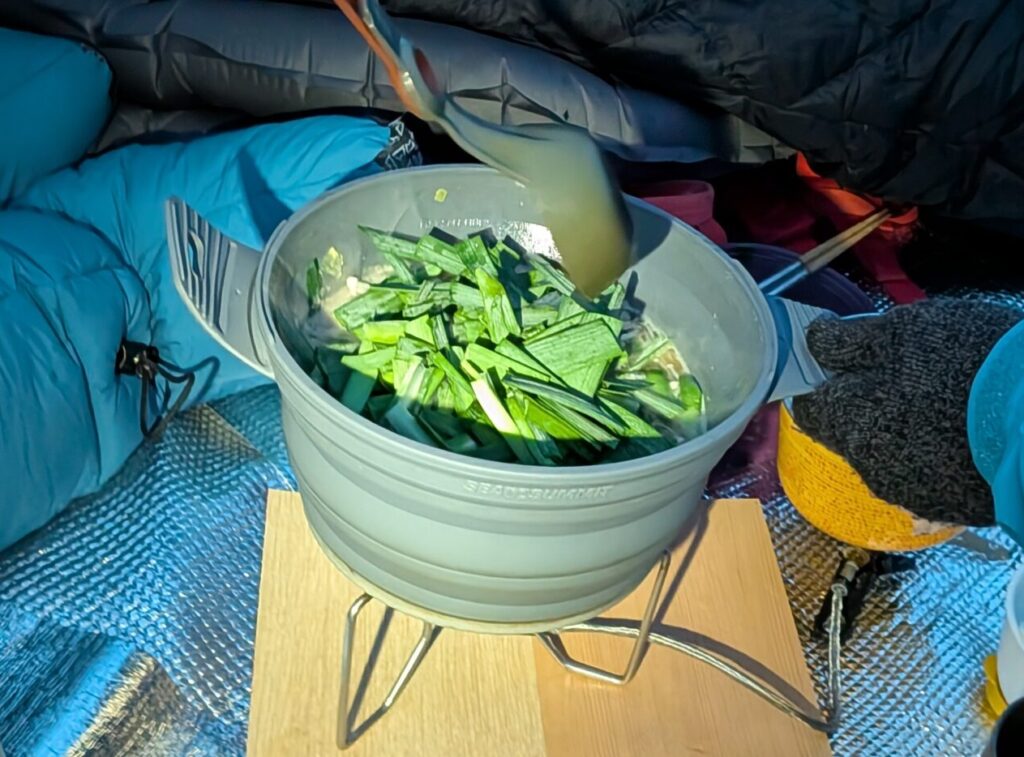 今回のメンバーは比較的防寒しっかりした人たちなので、極寒の八ヶ岳の夜も、寒くて眠れないということは無かったみたいです。私はいつも通り、モンベルダウン2枚とナンガの厳冬期シュラフと大量のマグマで快眠。起きたらとりあえずお湯を沸かして温まり、朝食はアタック後に食べることにして出発の支度をします。