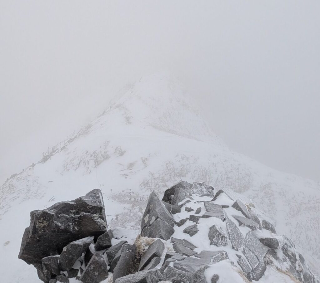 山頂直下では、強風と寒さから来る恐怖で時々足が止まりつつも、前を行くUさんに必死でついていきます。(私がビビりなだけで先輩方3人は平気そうでした。ただただ寒かったそうです。)