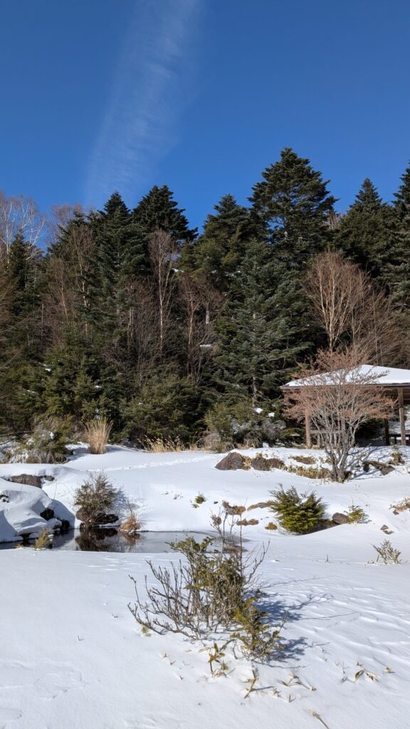 山頂はガスでも下はこの日も晴れなので、前日同様に木漏れ日の射す穏やかな雪道を黙々と下りて行き、10時半頃駐車場に到着。下界は暖かいです。