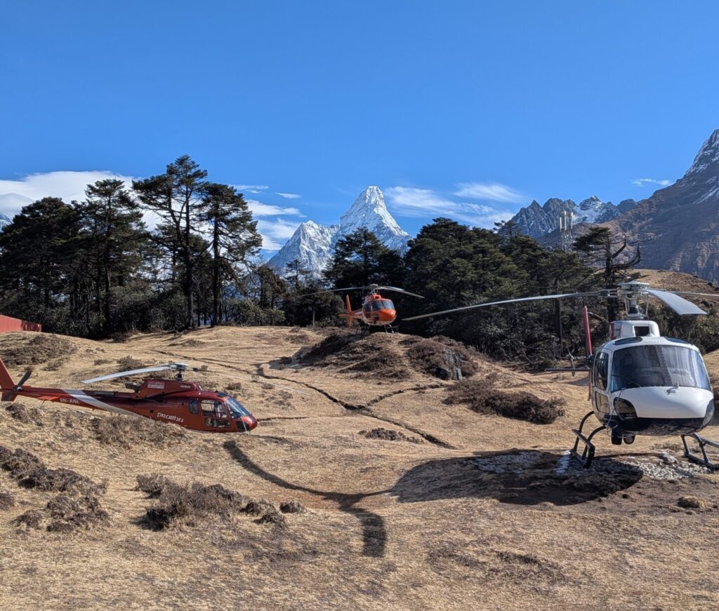 ホテルの前にはヘリがたくさん。ここまでヘリで来て、ホテルでランチだけ食べてヘリで帰る、なんていうVIPなお客さんも結構いるみたいです。(高いお金を払って山を歩く楽しみを捨てるなんて・・・。)