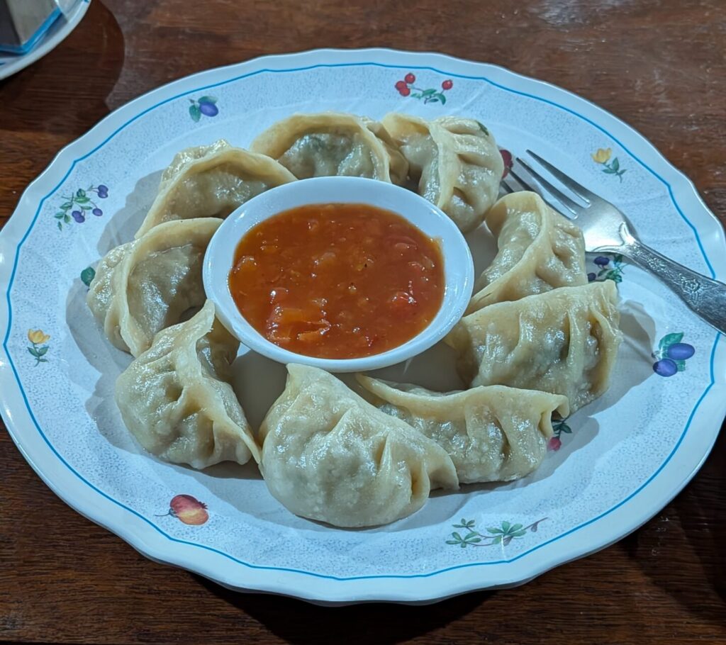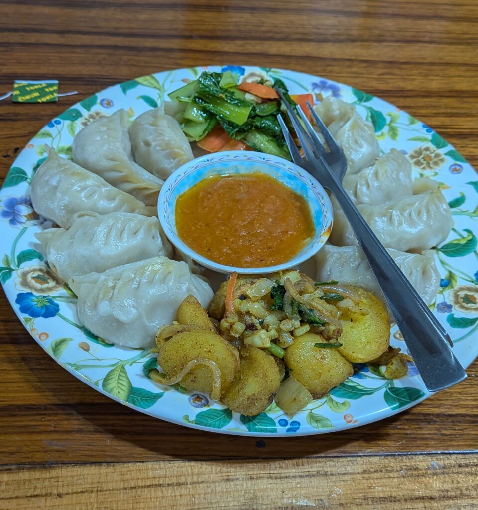 お昼のダルバートと夜のモモ。あんまり動いていなかったのでお腹パンパンでした。