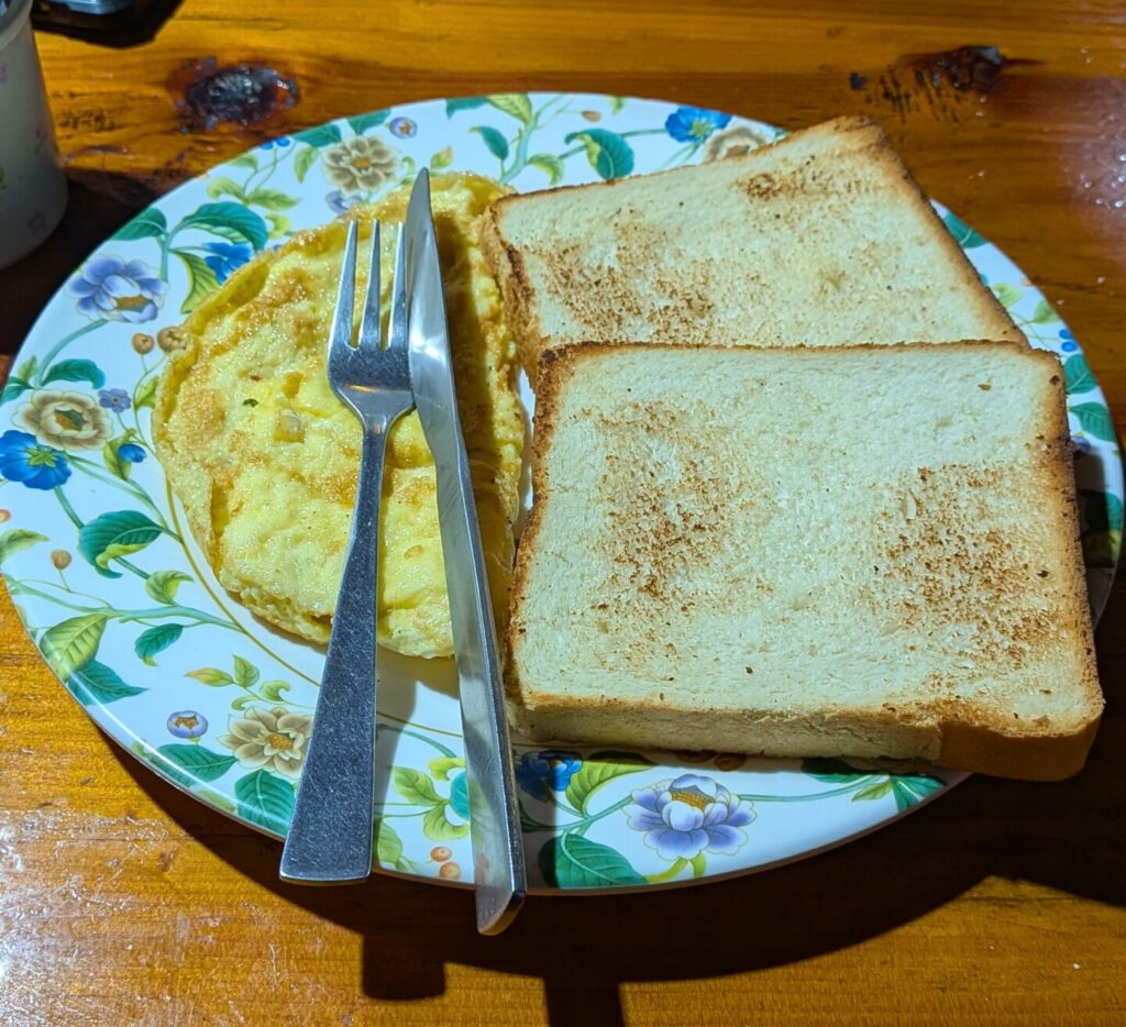 7:00 起床・朝食。高山病対策のため、1日に進める距離はそう長くないですし、日が当たるまでは寒いので、朝はゆっくり目です。