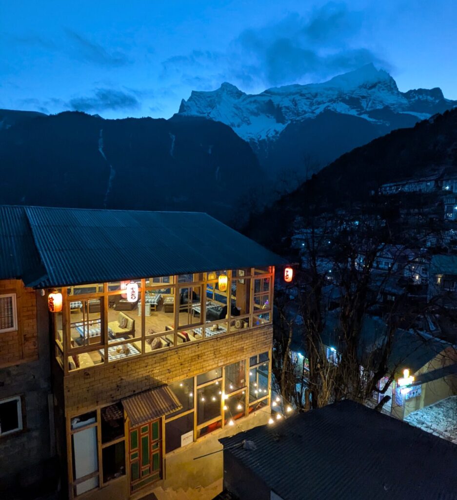 17:20 そんなこんなで時間が過ぎ、日暮れに自室から撮ったナムチェの夕景。目の前の居酒屋はさっきの「ともだち」で、奥の山はコンデリ(6187M)といいます。見える山みんな雄大ですね。