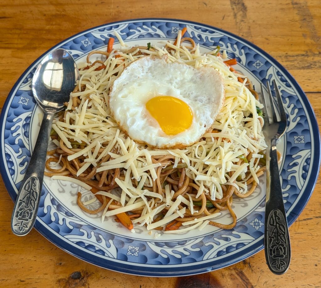 12:30 近いようで微妙に遠かった休憩地で頂いた昼食は「チャウメン」。ネパールの焼きそばです。これも日本のものより麺がモチモチしていて好き。トッピングが豊富なのも嬉しいですね。