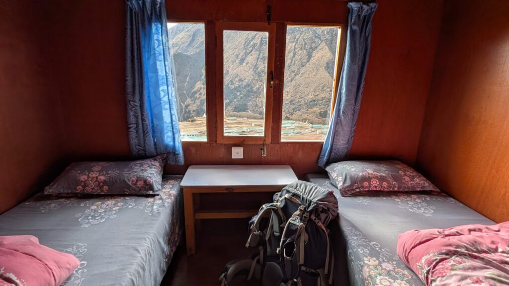 ネパールの山小屋は、日本の山小屋のような相部屋ではなくて、写真のように1部屋にベッド2つ置いてあるところが多く、2人で泊まっても1人で泊まっても宿泊費は同じ(食事代は別)です。なので2人で来た方がお得。