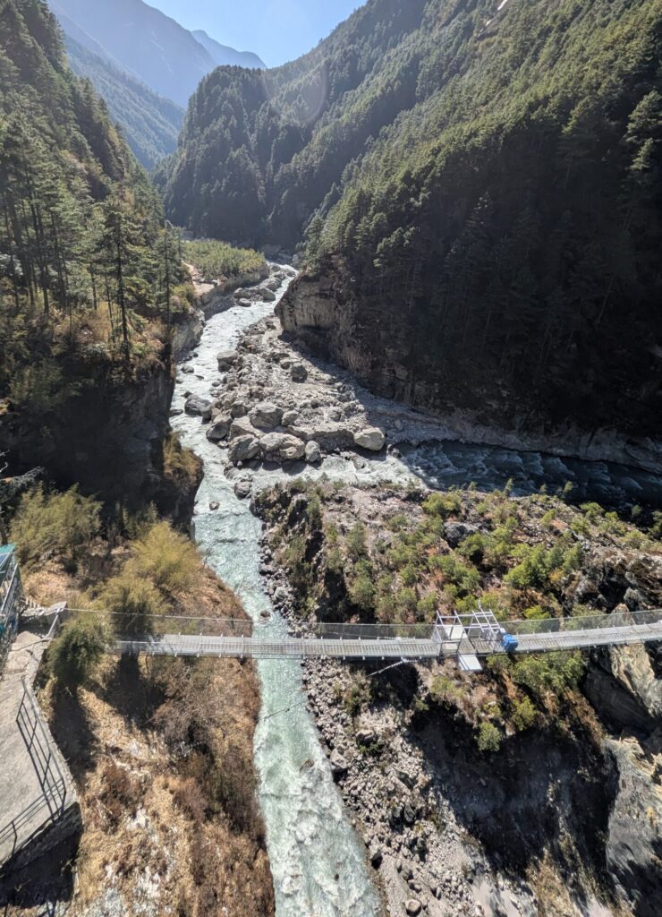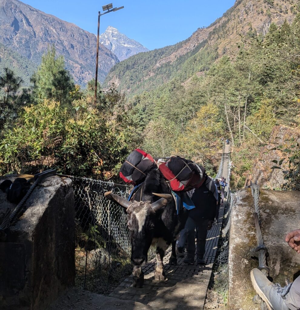 13:25 エベレスト街道では何回か吊り橋を渡るのですが、これがその1個目。ちょうどゾッキョの行列が渡ってきていたので、しばらく待ちます。