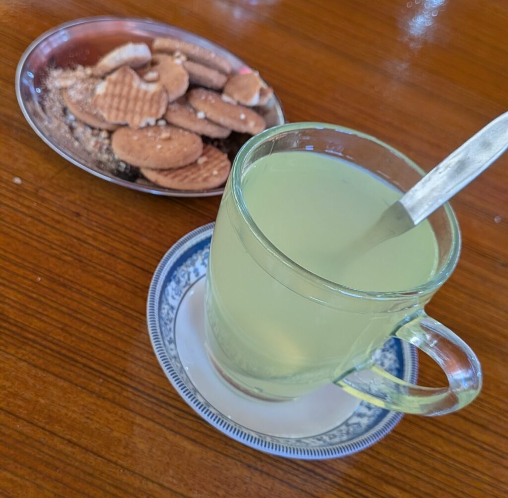 10:00 途中のジョルサレという村で休憩。トレッキング中幾度となく飲んだホットレモン。歩いていれば暖かいですが、止まればすぐに冷える時期なので、ホットレモンの暖かさと甘さが疲れた体に沁みます。
