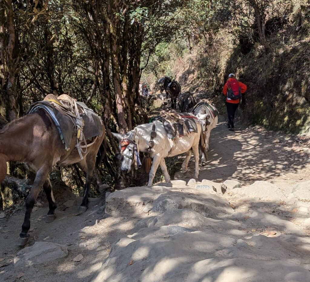 トレッキング中は荷運びに使われている動物とよくすれ違いますが、比較的標高の低いところで見かけるのがロバです。彼らとすれ違う際、谷側に立つのはNG。ぶつかってお客さんが谷に落ちる事故が時々起こるそうなので。