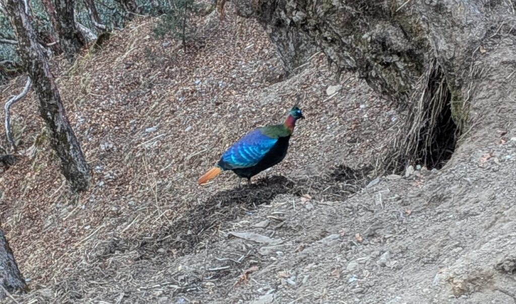 ネパールの国鳥であるキジ。ポルツェでは毎日夕方になると見られるようで、この日もたくさんいました。写真のキジは雄で、雌はもっと地味です。