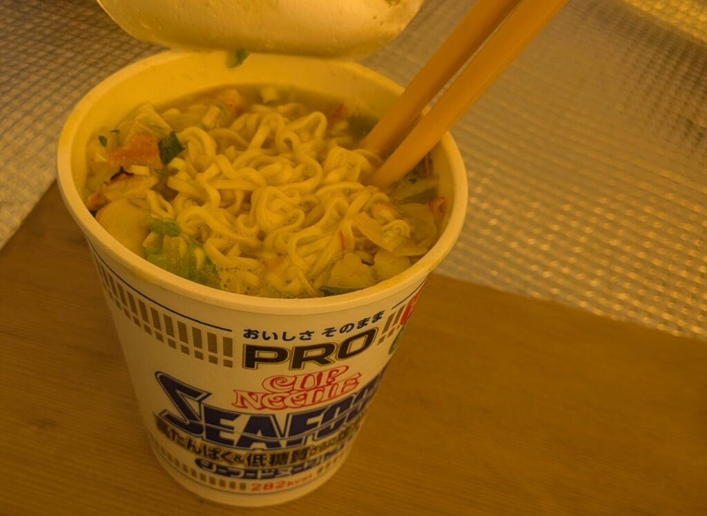16:30 テントを張った後少しゆっくりしたら、かなり早めですが暇なので、夕飯のカップラーメン(ちょっと健康志向な高たんぱく低糖質タイプ)。そのまま歯磨きもして寝る支度をします。