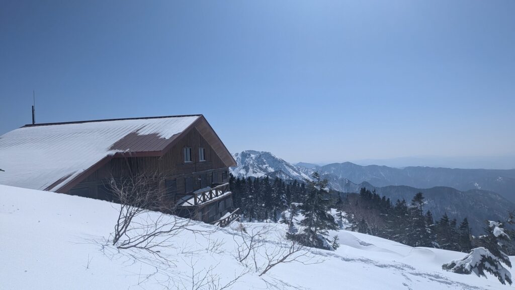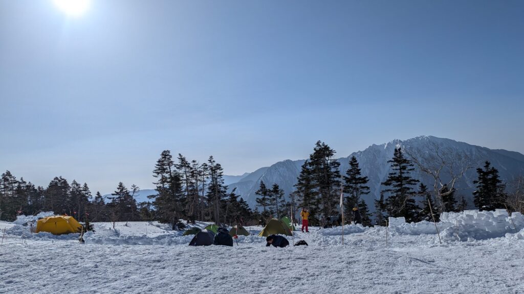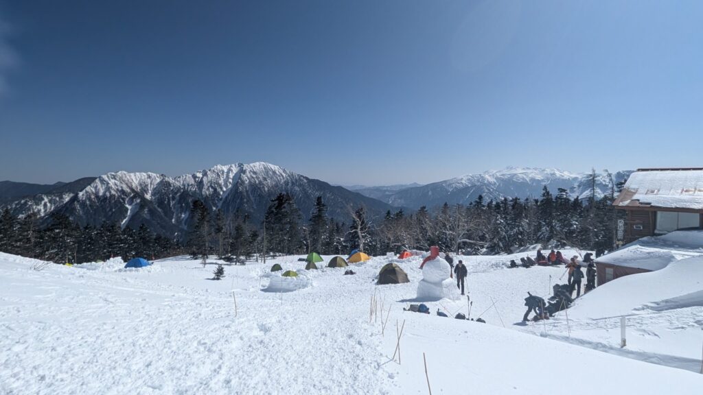 小屋で受付を済ませ、時間がたっぷりあるので丁寧に整地してテントを張りました。夏のハイシーズンだとテン場が一杯で張れなくなることもあるようですが、冬は連休の盛況と言えど、張れないほどにはなりません。めちゃくちゃ快適なテン場です。