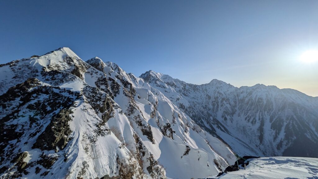 6:50 独標到着。この先を行くとピラミッドピーク、チャンピオンピークを経て西穂高岳に行けるのですが、ここからは難易度上がるらしいので止めておきます。岩雪ミックスのところをアイゼンで上り下りするのはまだ慣れない・・・。それにここですでにめっちゃ綺麗な眺め!